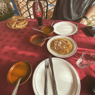 The air was frigid as I woke up at 7am. Camping in the cold desert but with a hot shower, is highly recommended. A jump over to the dining tent for a quick cup of coffee and we walked around the group who had an earlier appointment with their camel and walked out of the camp. My bare feet sinking into the cold sand as we clumsily climbed to the top of a small dune. Sinking into the sand to watch the sun rise and change the sky from orange to blue. Back down into the camp with “KimKim!” group of A+O for a breakfast of sweet pastries, coffee, and a dish of baked eggs over tomatoes in a Tajine pot. Delish! Perfect timing to climb back on to Coco C and head over the dunes to where Sallam was waiting with the car. An hour of slow going, watching the camel hooves shifting the sand and trying to discover the tracks I see from birds to small rodents to cat to snake. It was a beautiful morning for a camel ride and by the end I was fully elated and calm again. I patted Coco’s head. She yelled at me in response. I don’t think she had a good night of sleep but I’ll convince myself it was only because she was sad to see me go. Goodbye desert! Goodbye camels! Goodbye new friends! That was an amazing experience.